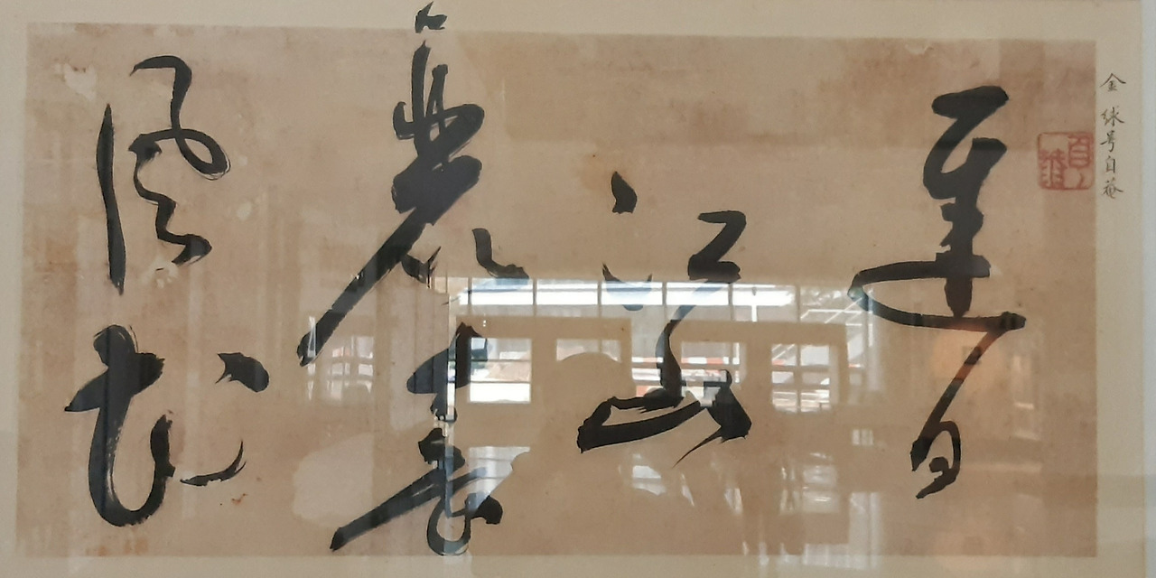 사진은 이 시의 '遲日江山麗 春風' 부분을 쓴 것이다. 조선 초기 4대 서예가(안평대군, 양사언, 한석봉, 김구)의 한 사람인 김구(金絿)가 쓴 것이다(김구는 초서로 유명했다). 서산시 호수공원 내 유료 주차장 설치 반대 도청 기자 회견 응원차 도청에 갔다가 찍었는데, 문외한이 봐도 멋진 글씨라는 느낌을 받았다. 전작(全作)을 표구해 걸었으면 더 좋았을 텐데, 하는 아쉬움이 들었다(나머지 부분은 망실된 듯하다).