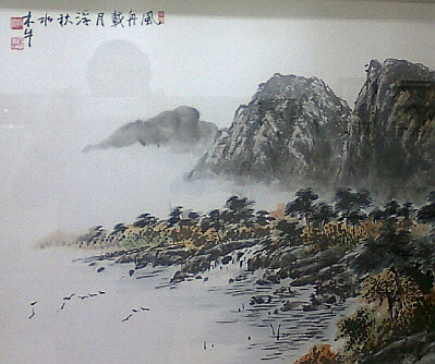 이 그림의 배경이 되는 시간대는 달이 보이는 저녁이 아니다. 낮이거나 저물녘이다. 그리고 바람맞은 배는 어디에도 눈에 띄지 않는다. 그림과 화제가 맞지 않는 것이다. 실소가 나올 수밖에. 인터넷을 찾아보니, '풍주재월부추수'는 가을 풍경을 그린 동양화에 상투적으로 사용하는 글귀였다. 이 그림을 그린 분은 가을 풍경을 그렸기에 이 화제를 별생각 없이 갖다 쓴 것 아닐까 싶었다. 멋진 그림에 어울리지 않는 화제를 써서 스스로 그림의 가치를 반감시켰다. 화제는 동양화(한국화)를 완성시키는 마지막 2%인데, 매우 아쉬웠다.