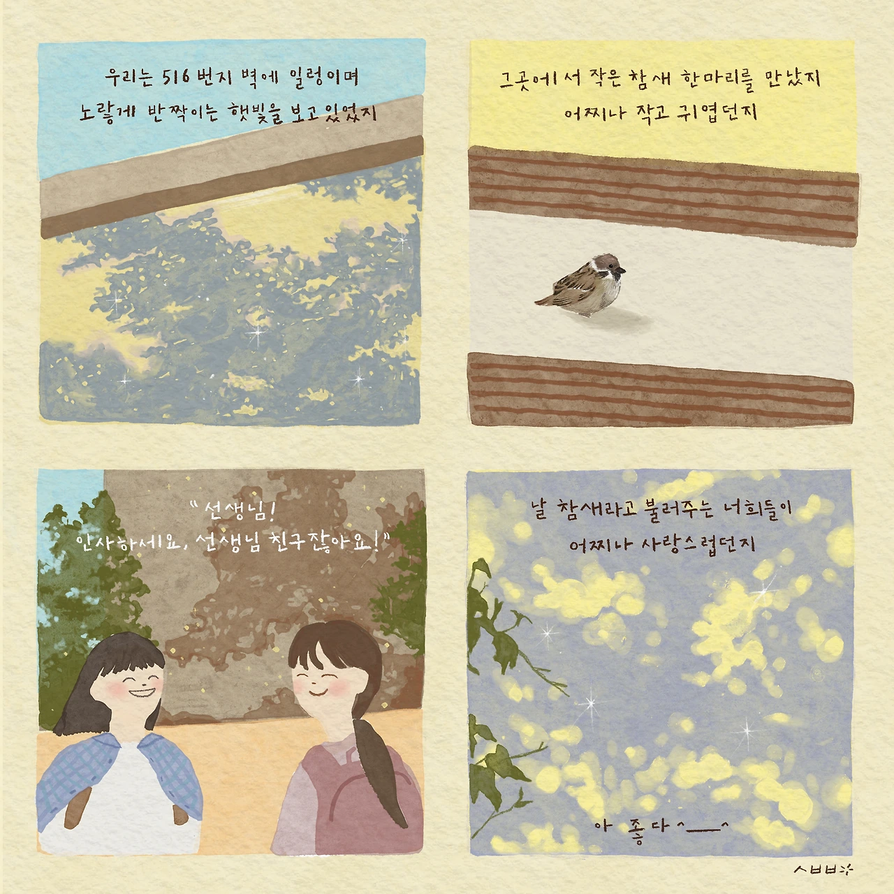 반짝이는 노란 햇빛은 마치 우리가 나란히 걸어갈 풍경을 보여주는 듯했다. 우리는 때때로 아주 밝게 웃고, 잠시 느리게 주변을 거닐다가 다정하게 인사 나누며 헤어졌다.