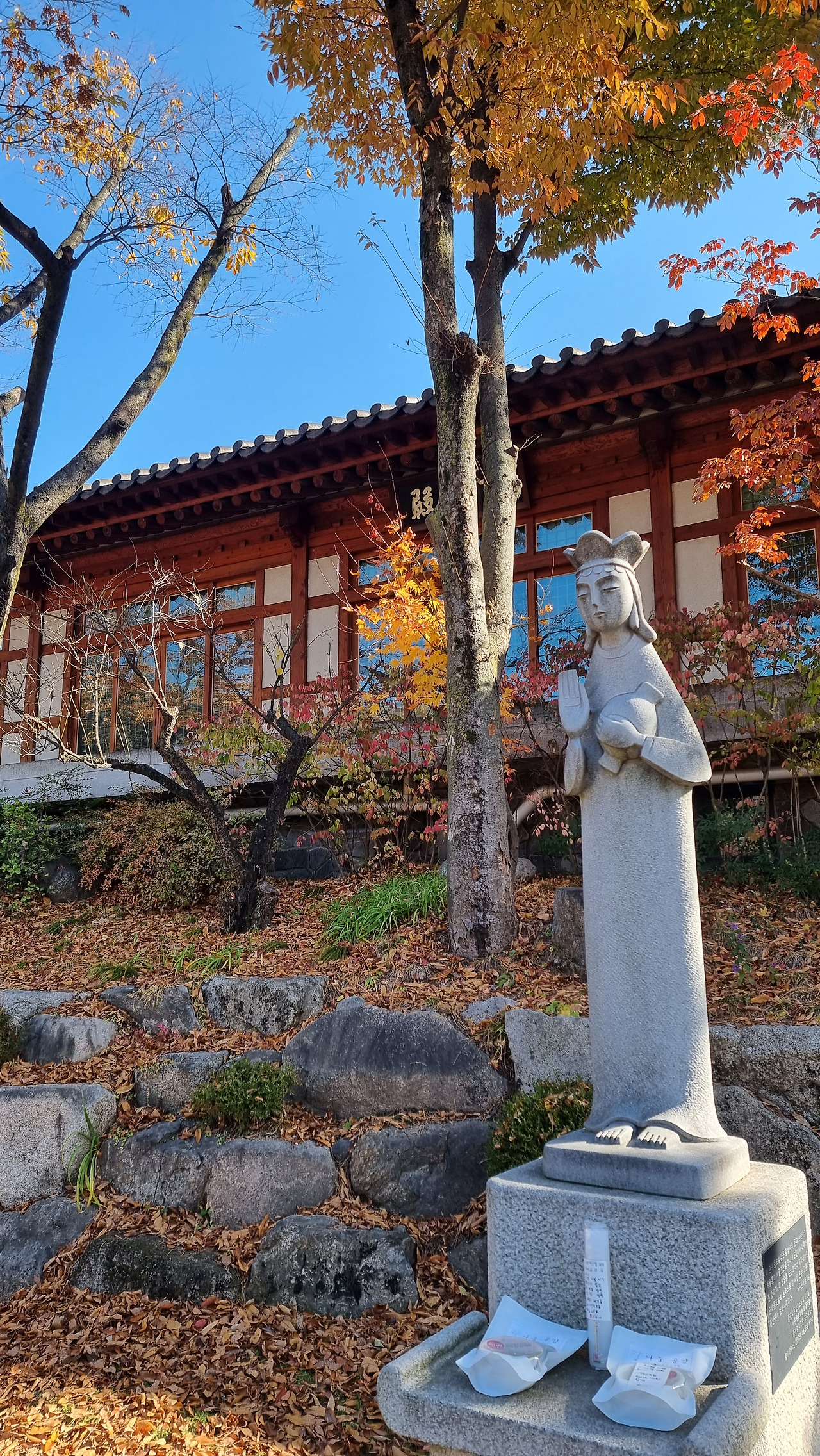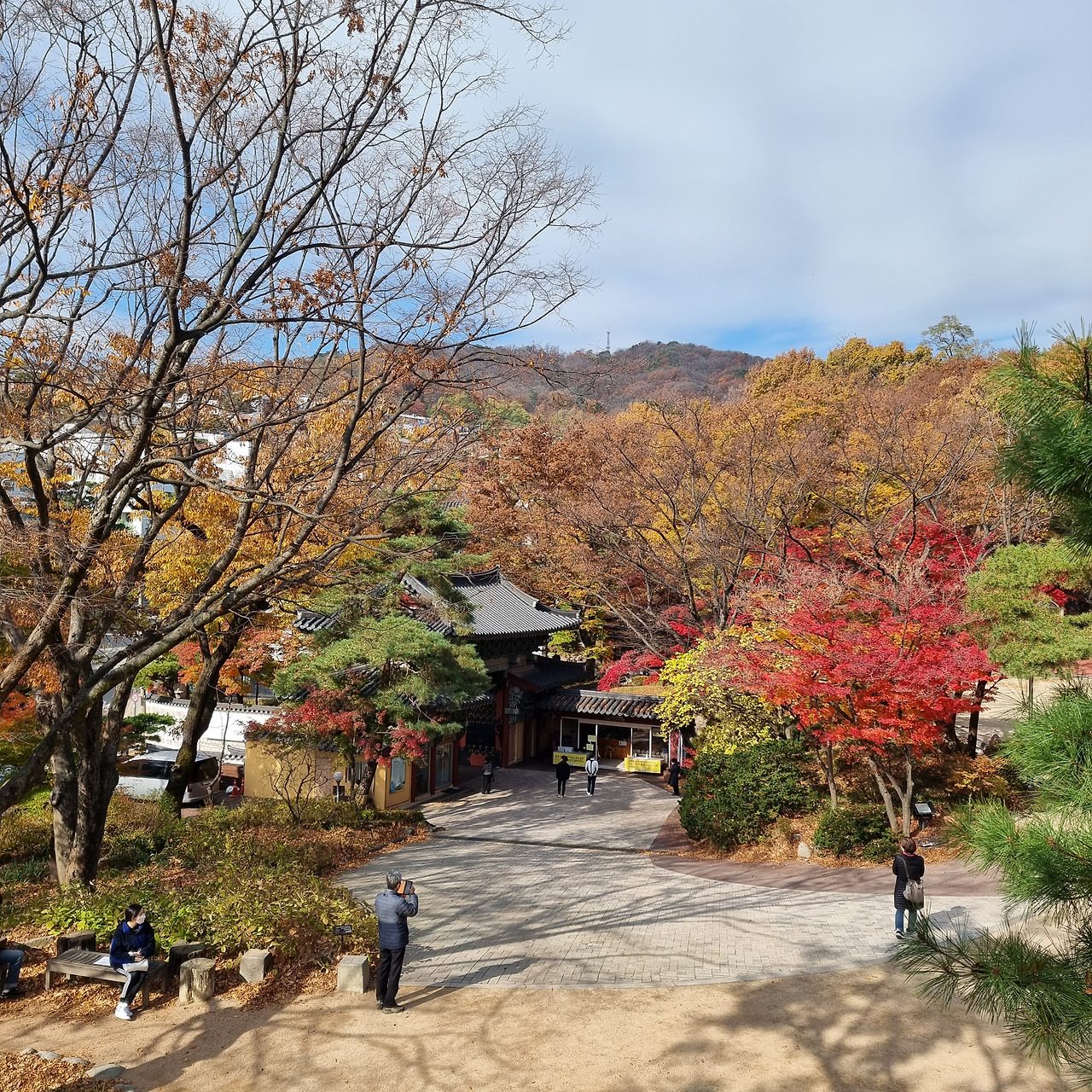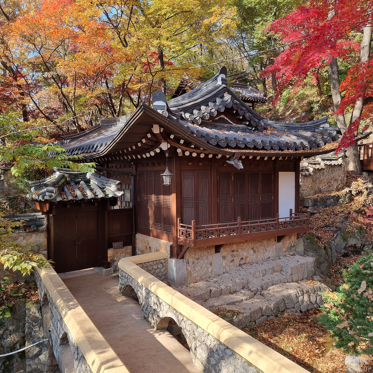 사람과의 만남을 은밀하게 이루어지게 하는 곳이라 각각의 건물을 가리듯 잎사귀 달린 나무들이 절묘하게 보호색을 만든다. 봄과 여름 그리고 겨울에는 건물과 자연이 비슷한 색감을 풍기며 한 몸이 된 것처럼 존재하지만 가을이 되면 단풍색이 도드라져 비로소 절을 품고 있는 계곡의 전경을 구분할 수 있다. 깊은 산속 분간하기 힘든 공간으로 나아갈 때 각각의 존재들을 구분짓게 하는 가을 단풍은 본래 요정이었던 이 절의 미학을 정의해 주는 장치이다.