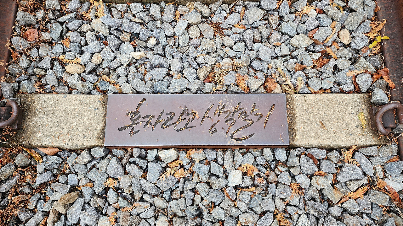 철길을 따라서 한참을 걷다 보면 철길 중간에 글자가 새겨진 녹슨 철판이 보인다. 무엇이라고 썼을까? 다가가서 낙엽이 앉은 철판 위로 바람을 훅 불자 다음과 같은 글자가 나온다.