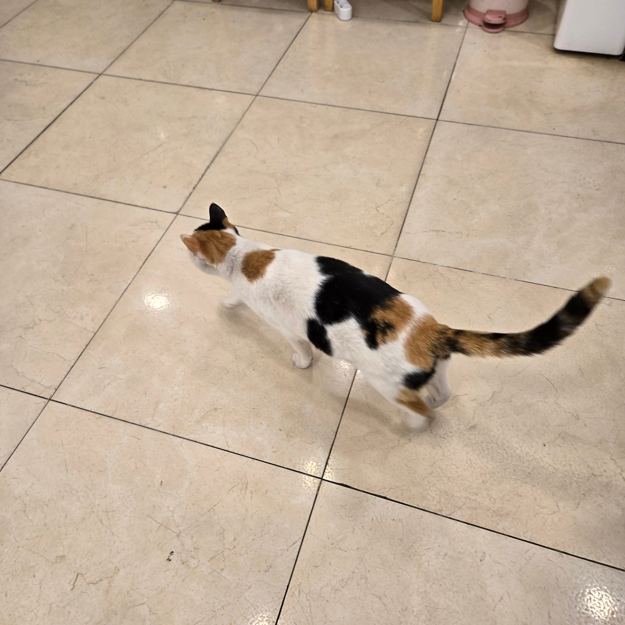 서울로 돌아가는 날 숙소 열쇠를 반납하고 짐을 정리하려 로비 앞 의자에 앉아 있는데 삼색이가 다가온다.