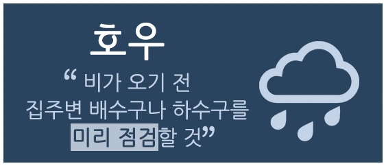 최근 우리나라는 예전에 비해 국지성 집중호우가 빈번해졌는데요, 그로 인해 침수 산사태 유실 등 많은 피해가 발생하고 있어요. 피해를 줄이기 위해서는 비가 오기 전 집 주변 배수구나 하수구를 점검해 이물질로 인해 막힌 곳이 없도록 조치합니다. 또한 지붕이나 벽 틈새로 빗물이 새는 곳이 있다면 미리 보수 작업을 해놓습니다.