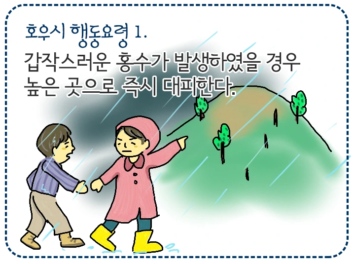 갑작스러운 집중 호우가 발생하면 일단 저지대를 벗어나 높은 곳으로 대피합니다.