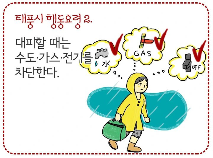 집이 침수되면 가스 누출이나 누전의 위험이 있으니 대피시엔 미리 수도·가스·전기는 차단합니다. 태풍이 지난 후 집에 돌아온 후에도 반드시 전문업체에 연락하여 안전을 확인한 후 사용하셔야 합니다.