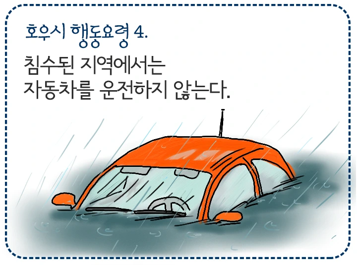 침수된 지역에서 자동차를 운전하면 위험합니다. 운행 중인 자동차의 속도는 줄이고, 물에 잠긴 도로나 잠수교를 피해 저단 기어로 운행합니다. 침수 지역에서 불가피하게 이동해야 하는 경우 부유물 등을 이용하세요.