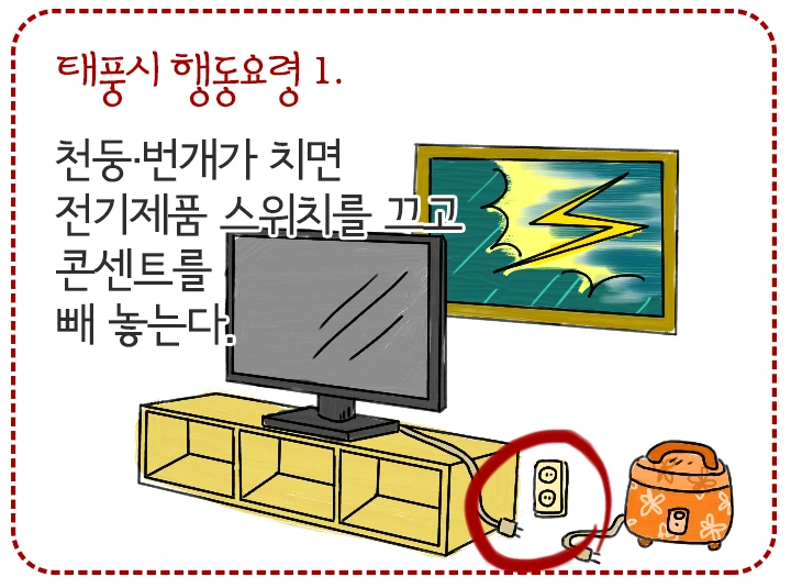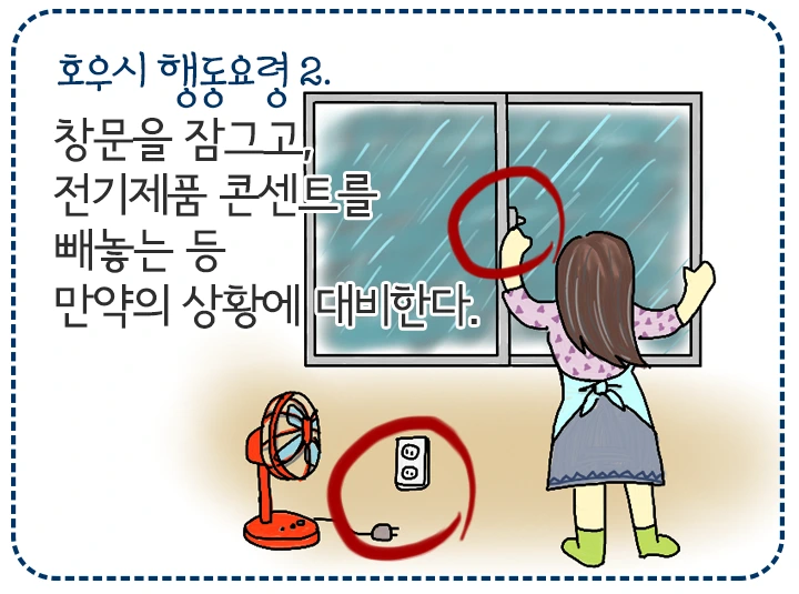 시간적 여유가 있다면, 마당에 있는 여러 가지 물건들을 집안으로 옮기고 집 주변을 정비하세요. 또 창문과 출입문을 잠그고 천둥·번개가 치면 전기기구 스위치를 끄고 콘센트를 빼 놓으세요. 감전과 화재의 위험이 있습니다.
