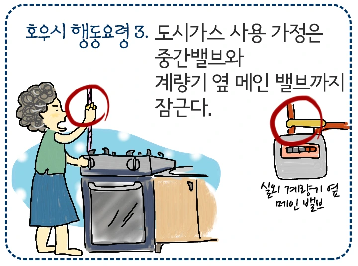 도시가스를 사용하는 가정은 중간밸브뿐만 아니라 계량기 옆의 메인 밸브까지 잠그고 대피해야 합니다. LP가스를 사용하는 가정은 용기에 부착된 용기밸브를 잠그고 체인 등을 이용, 안전한 장소에 고정시켜 놓고 대피합니다.