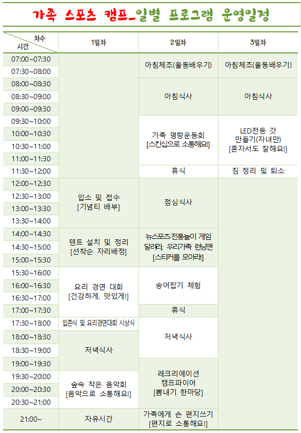 취약계층가족 대상 캠프는 철원 가산농원캠핑장에서 9월 8일부터 9일까지 진행되는데, 참가자는 위 두 캠프와는 다르게 25개 자치구체육회를 통해 추천받아 선정하지요.