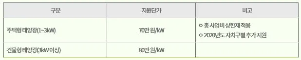 서울시는 주택형과 건물형 미니태양광 설치를 확대하기 위해 올해 보조금 단가를 2019년 kW당 60만 원에 비해 주택형은 17%, 건물형은 33% 각각 상향하였다.
