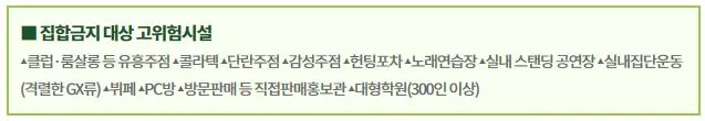 클럽, 노래연습장, 뷔페, PC방 등 고위험시설 12곳의 운영도 금지된다. 다만, 고위험시설 중 유통물류센터는 필수산업시설로 이번 집합금지 조치에서 제외됐다.