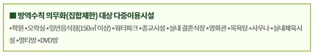 민간 다중이용시설 중 결혼식장, 영화관, 목욕탕 등 위험도가 높은 일부 다중이용시설 12개 업종에 대해서는 방역수칙 의무화(집합제한) 명령이 시행된다.