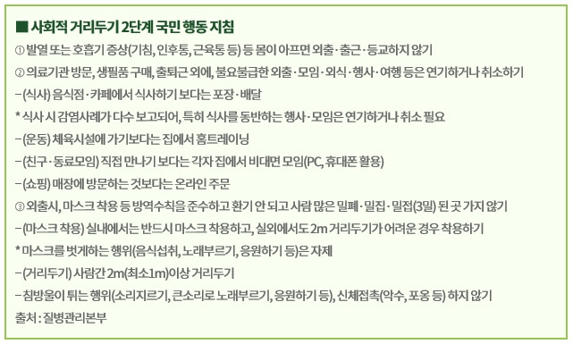 강화된 사회적 거리두기 2단계 기간 일주일 간은, 각자가 방역의 주체로서 최대한 외출과 만남은 자제하고 외부활동을 멈춰주시길 호소드립니다.
