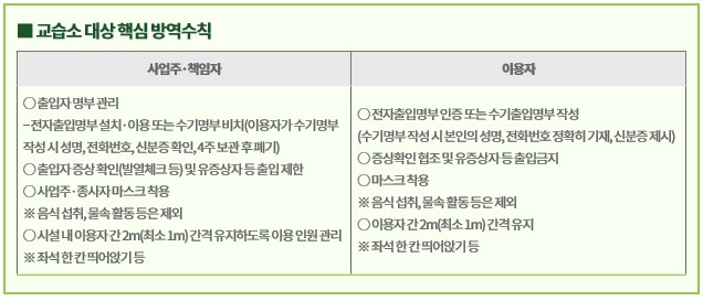 교습소는 이번 집합금지 명령 대상에서는 제외됐으나, 여전히 집합제한 조치는 적용받게 된다. 출입자 명단 관리, 마스크 착용 등 핵심 방역수칙 준수 의무가 부과되며, 이를 위반할 경우 바로 집합금지 명령와 함께 고발 조치 및 구상권(손해배상) 청구도 이뤄진다.