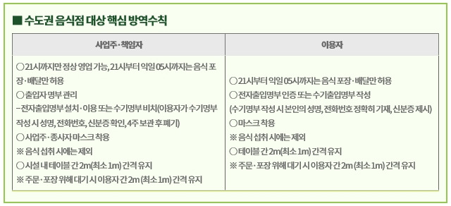음식을 조리·판매하는 일반음식점(거리가게 포함), 휴게음식점, 제과점은 21시까지만 정상영업이 가능하며, 21시부터 익일 05시까지는 음식 포장·배달만 허용한다.