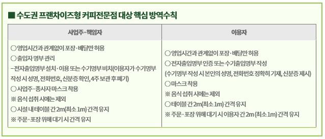 프렌차이즈형 커피전문점은 영업(운영)시간과 관계없이 포장과 배달만 허용하는 내용의 방역수칙이 추가·포함됐다. 음료 등을 포장해 갈 때에도 출입자 명부 작성, 마스크 착용, 이용자 간 2m(최소 1m) 간격 유지의 핵심 방역수칙은 준수해야 한다.