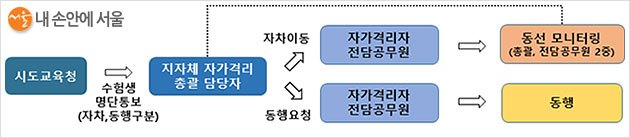 자가 격리 대상 수험생의 경우 수능 당일 자치구 전담반 또는 119구급차로 별도 시험장(22개소)까지 이동할 수 있도록 돕는다. 원칙은 자차로 이동하고 전담공무원이 GIS상황판을 통해 동선을 관리하지만, 자차이동이 불가한 경우 전담공무원이 동행해 단계별로 이동노선을 지원한다.
