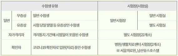 - 확진자와 격리자는 시험 응시장소가 다르고 정해진 시험장이 아닌 시험장에서 응시가 불가능