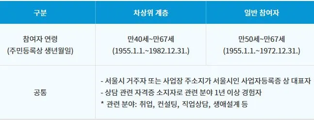 ○ 모집대상: 서울시 거주 만50~67세 또는 만 40~67세 차상위계층 시민
