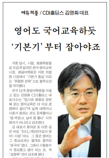 매일경제 2006.05.27. 「CDI홀딩스 김영화 대표 - 영어도 국어교육하듯 '기본기'부터 잡아야죠」