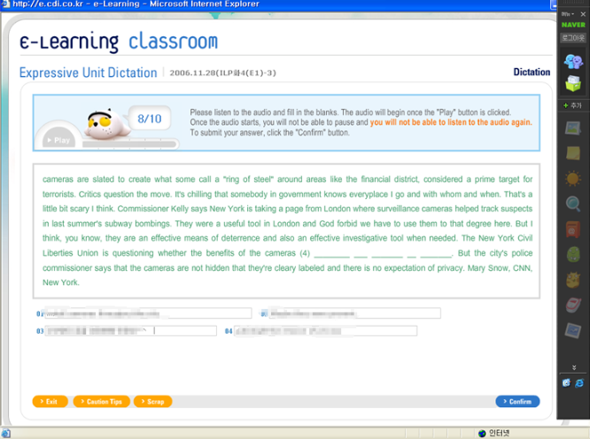 청담어학원의 특징이라고 하면 한 20% 정도는 오프라인 교재로 숙제를 했는데, 나머지 80%의 숙제는 온라인으로 진행을 했다는 점에 있다. 이 시대에는 굉장히 혁신적이었다. 리스닝의 경우 '단 한번'만 듣고 저 빈칸들을 채워야 했고(You will not be able to listen to the audio again!) 라이팅의 경우 작문을 해서 제출하면 강사들이 첨삭과 평가를 내려주곤 했다.