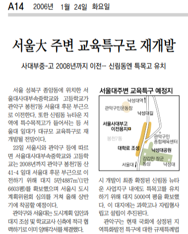 이 해는 슬슬 '봉천 신도시'에 첫 입주할 때 유치원생이거나 초등학생이었던 아이들이 차츰 중, 고등학교로 진학할 시기가 된 만큼 이러한 뉴스로 한 해가 시작되었다. 현재를 보면 알다시피 완전이전은 빠르게 무산되었고, 이어서 제2사대부고를 건립하네 마네 하다가 결국 이것도 좌초되었다. 당연히 기존에 서울사대부고가 위치하고 있는 성북구의 극렬한 반대도 컸고, 사실 관악구 학부모들도 '오면 좋다' 정도였지, 강경하게 강대강으로 반드시 유치해야한다! 이런 분위기는 아니었다. 우리 동네는 강남, 특히 서초가 너무 가까웠다. 일단 특목고가 우선이고, 특목고가 안되면 강남 서초로 보내자는게 봉천 신도시 상위권 학생 부모들의 공통된 생각이었다. 봉천 신도시의 초기 입주민들은 아이들을 여기서 초중고 다 보내겠다는 생각이 없는 경우가 많았다.
