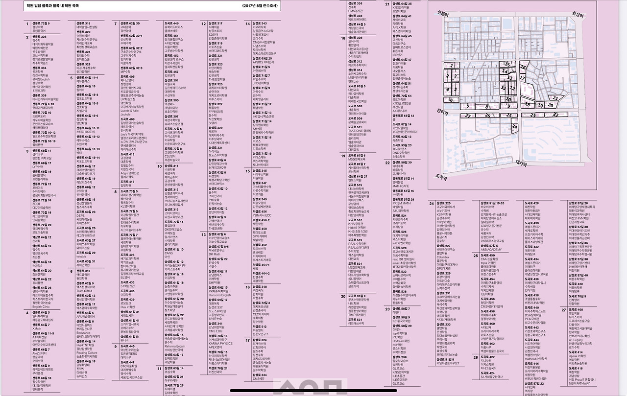 대치동을 사교육 중심지로 만드는 핵심은 사실 대형 학원이 아니라 소규모 학원이었다. 위의 이미지는 서울역사박물관에서 2017년에 발간한 '2017 서울생활문화자료 조사 - 대치동 사교육 1번지'에 수록된 '학원 밀집 블록과 블록 내 학원 목록'이다. 저 목록은 심지어 해당 블록 내의 학원만 수록한 것인데도 저렇게 빽빽하게 있는 것이다. 내가 다닌 학원들 중엔 삼성동, 개포동 등 저 블록 밖에 위치한 학원도 있었고, 대치동에 위치하면서도 선경어학원이나 메가스터디 등 대치역 남측에 위치하던 학원들은 표시하지 않은게 저정도다. 어마어마한 수였고 저기서 하나를 골라야 하는거였다. 사실 영어학원(선경어학원)이 첫번째 시도만에 성공한게 운이 기막히게 좋은거였고, 수학학원 실패가 확률상 당연한 것이였을지도 모른다.
