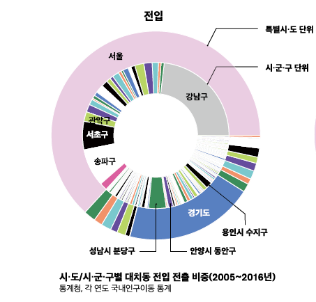 시군구별 대치동 전입 전출 비중. 2005년~2016년으로 우리 가족이 이주했던 2010~2015년이 전부 들어가는데, 관악구가 유의미한 비중을 차지하고 있다.