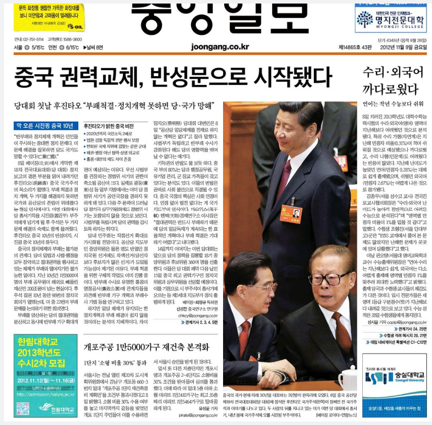 2012년 11월 9일 금요일, 중앙일보 1면.