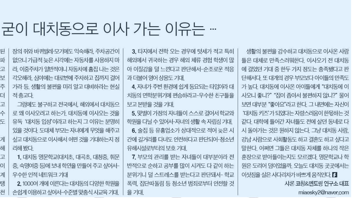 "내가 여기서 전세 산다고 우습게 보는거야? 나도 OO동에 번듯한 내 집이 있어! 애들 공부시키려고 여기 와 있는 거지." 2000년대 후반으로 갈수록 이 새로운 유입자들이 대치동 학부모의 주류가 되었다,