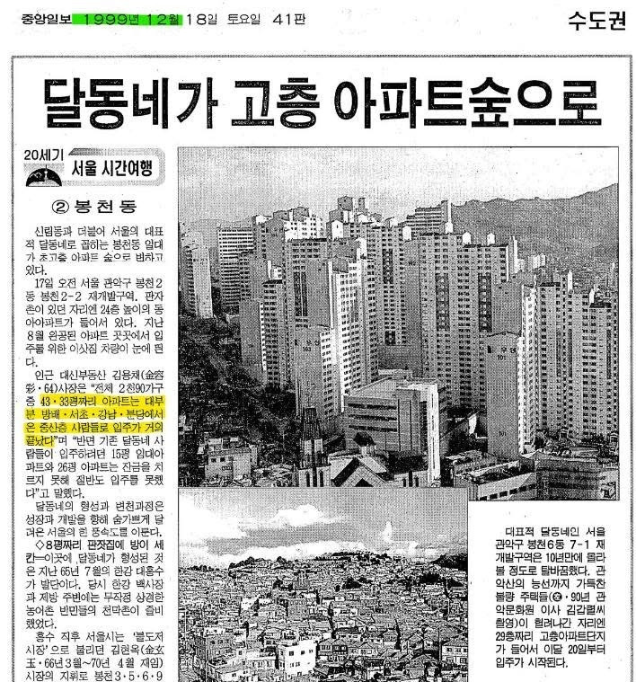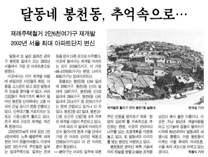 우리는 흔히 이 시기 철거된 무허가 주택에 거주하던 '철거민'의 이야기는 많이 접할 수 있지만, 이러한 재개발 지역에 새로 들어온 '중산층'이라고 불리던 사람들에 대해선 무관심하다. '중산층'하면 서울 강남이나 경기 1기 신도시 지역만 생각하기 일쑤다. 그러나 분명 기존 도심의 재개발지역에도 대규모의 '중산층'이 들어왔고, 그들이 새로운 지역 문화를 만들어 갔다. 봉천동, 신림동의 행정동 이름이 모두 바뀐 것도 이들의 주도로 이뤄졌던 일이었다.