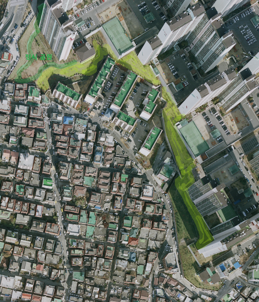 취학 이전~초등학교 저학년의 굉장히 어린 나이였고, 또 초기 입주민이였기에 가질 수 있는 기억이었다. 지금은 저 공간에도 빽빽한 밀도로 나무들이 자라 있다.