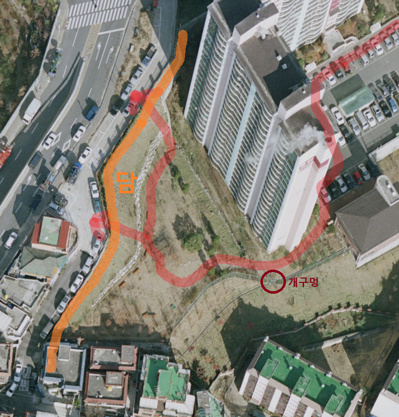 그런 공간들 탐험을 했다. 소위 개구멍을 지나서. 지도만 보면 일두아파트가 동아아파트에 폭 감싸안아진 모양을 하고 있는데 실제로 그 지역을 가보면 깜짝 놀라게 될 것이다. 고도부터가 다르고 절대 왕래를 할 수 없도록 공간구조가 짜여져 있다. 나중에 언급할 임대아파트와도 고도를 의도적으로 다르게 설계를 해두어서, 분양아파트와 임대아파트 간의 경계가 의도적으로 구축되어 있음을 볼 수 있다.