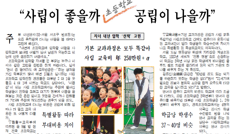 처음에는 근처의 사립초등학교인 중대부속초등학교에 나를 보내려고 했다. 어느 겨울날 엄마 손을 잡고 중대부초를 한 번 갔던 기억이 난다. 우리 봉천동 신축 아파트 주민들은 사립 초등학교에 아이들을 보낼 능력이 충분히 되는 사람들이었다. 사립초등학교는 1997년 IMF 외환위기 직후 인기가 잠시 주춤했지만, 2000년대에 접어들며 다시금 인기를 회복하고 있었다. 특히 영어 조기교육, 특화된 예체능 수업 등 국공립 학교에서 제공하지 못하던 다양한 프로그램이 사립학교의 경쟁력으로 부각되었다.