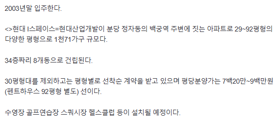 한편 위에 첨부한 내용은 2000년 말에 게시된 아파트 광고 기사인데(현재의 분당현대아이파크이다. 이 시기가 아파트 브랜드가 막 태동하기 직전이라 가브랜드와 실제 지금 쓰이고 있는 브랜드가 다른 경우가 상당히 많은 편.) 부대시설로 수영장, 골프연습장, 스쿼시장, 헬스클럽이 명시되어 있다. 이 시기 중상층~상류층의 문화생활 추구미가 어땠는지 알 수 있는 부분으로 우리는 저런 문화를 옆 아파트의 상가나 지방자치단체에서 운영하는 스포츠센터에서 체화했지만 어찌 됐든 그 문화를 향유할 수 있는 위치에 있었던 것이다.