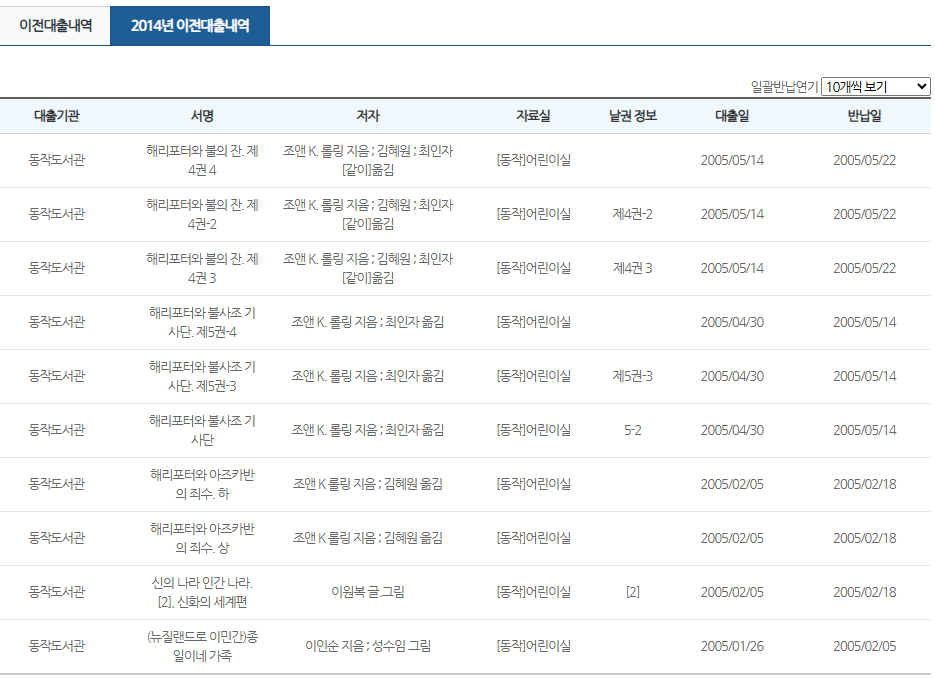 2004년까지는 도서관에 직접 와서 읽기만 하다가, 2005년부터 대출해서 읽었다. 그 시절 어린이실 대출 기록은 현재까지도 남아서 확인할수가 있는데, 동작도서관 어린이실의 대출 기록이 찍혀 있는 걸 보면 그래 내가 여기서 자랐지 싶다.