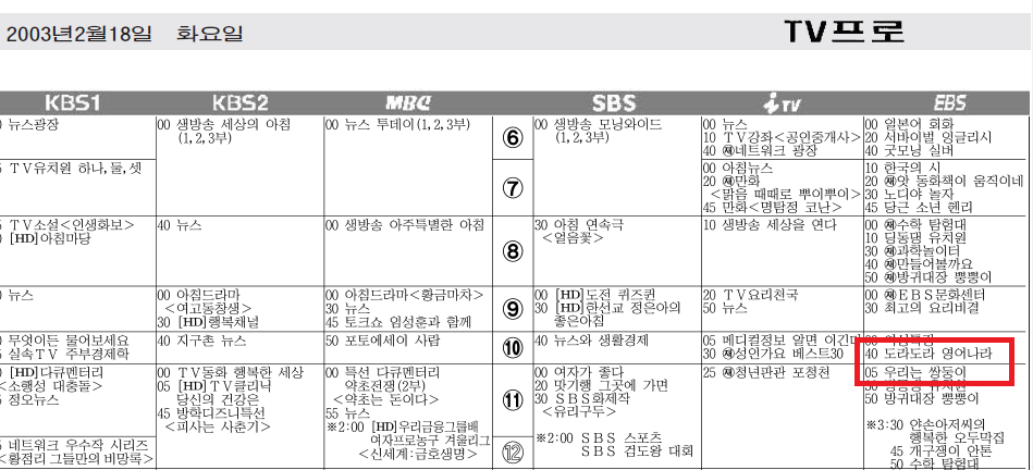 그날도 루틴처럼 매일 아침 11시에 하던 '우리는 쌍둥이'를 봤다. 그리고 그날이 동생 유치원 졸업식이었나 그랬다. 우리는 쌍둥이가 끝나고 엄마랑 외출준비를 하면서 채널이 일반 지상파 채널로 옮겨졌는데 그 순간 내 눈앞에 펼쳐진 광경이 너무 충격적이었다.
