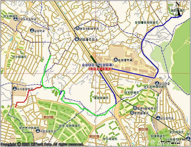 2003년의 지역 지도. 당시에는 상도동의 상도래미안3차, 힐스테이트상도프레스티지&센트럴파크, 상도동더샵, 상도역롯데캐슬파크엘, 사당롯데캐슬골든포레 등이 모두 건설되기 전으로 봉천신도시 지역이 최대 신축아파트촌이었다. 위에 묘사한 약수아파트도 표기되어있으며, 국사봉터널이 없는 것도 포인트. 국사봉터널은 2004년 개통했다.
