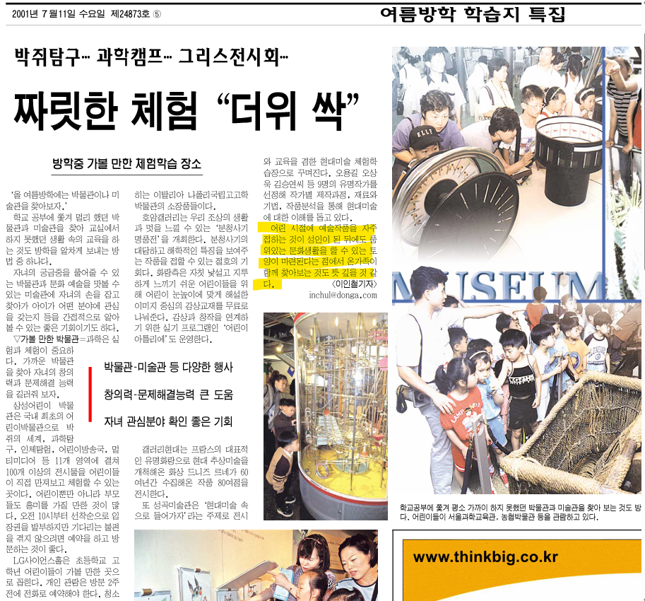 코엑스 전시회 외에도 여러가지 문화활동 체험을 한 기억이 있다. 혜화에 있던 국립서울과학관, 여의도에 있던 LG사이언스홀, 서대문구에 그 당시에 개관했던 서대문자연사박물관(2003년 개관), 우리 지역에 있던 호림미술관(1999년 신림동으로 이전)과 남서울미술관(2004년 개관) 등등.