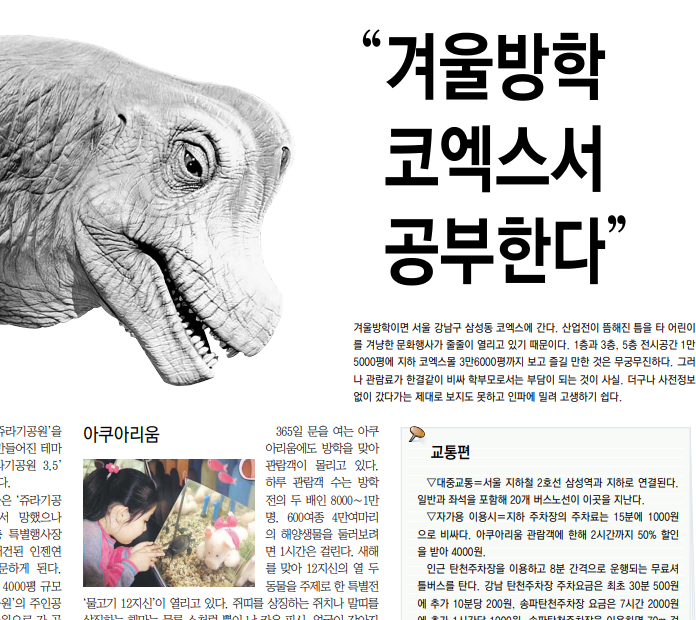 겨울방학이면 서울 강남구 삼성동 코엑스에 간다. 산업전이 뜸해진 틈을 타 어린이를 겨냥한 문화행사가 줄줄이 열리고 있기 때문이다. 1층과 3층, 5층 전시공간에 지하 코엑스몰 3만6000평까지 보고 즐길 만한 것은 무궁무진하다. 그러나 관람료가 한결같이 비싸 학부모로서는 부담이 되는 것이 사실. 더구나 사전정보 없이 갔다가는 제대로 보지도 못하고 인파에 밀려 고생하기 쉽다.