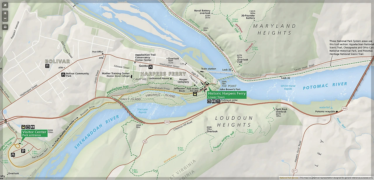 하퍼스 페리 역사 지구: 공원 내에는 역사적인 건물들과 유적들이 그대로 남아 있어 19세기 당시 하퍼스 페리의 모습과 사회적 상황을 그대로 엿볼 수 있다.