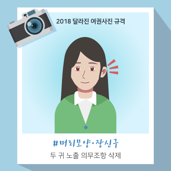 여권 사진 찍을 때 반.드.시.귀가 나와야 하는 조항이 삭제되었지만 눈썹은 여전히 보여야 하며 얼굴 윤곽을 가려서는 안 돼요.