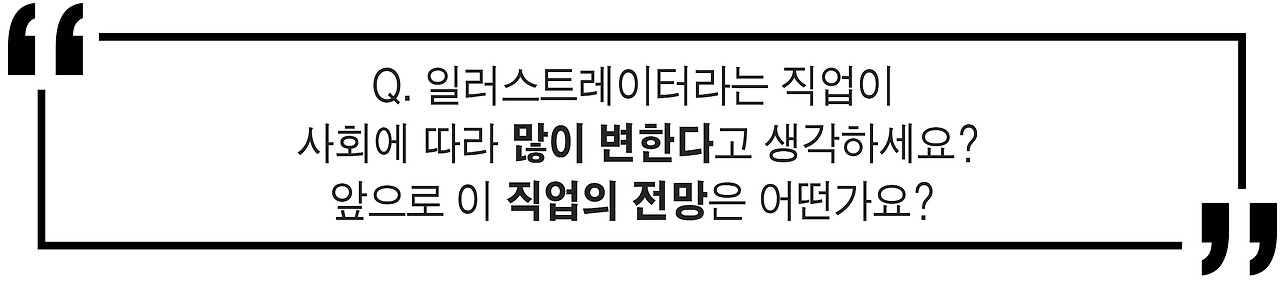 그 다음엔, 혼자서 작업하는 게 아니라 다른 사람들, 클라이언트 나아가 소비자들과 소통하는 작업이라는 걸 인식하는 게 중요한 것 같아요. 혼자 마음대로 그리는 그림으로는 직업적인 일러스트레이터라고 할 수 없어요. 계속 자신을 유지하되 소통을 해야 하는 일이라는 걸 인지해야 합니다.