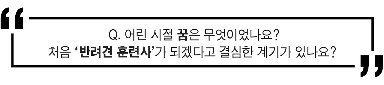 강형욱 : 어렸을 때부터 개들과 함께 있는 것을 좋아했어요. 개들과 함께 사는 것이 꿈이었죠. 그러다 보니 반려견 훈련사라는 직업을 자연스럽게 알게 되었고, 지금에 이르게 되었습니다.