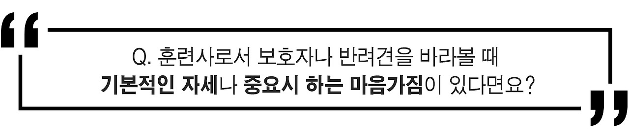 훈련사를 하려고 할 때 가장 중요한 것은 개를 좋아하는 것이지만, 사람과 함께 행동하고 있는 개를 교육하는 것이므로 그 개가 살고 있는 환경을 이해하고 수용하고, 인정하는 과정이 필요합니다. 강아지를 키우는 사람이 주인이기에 주인(사람)과 대화하는 것이 중요해요. 동물과 일하는 것 같지만, 사실은 사람과 밀접하게 일을 하는 직업이기 때문에 동물이랑만 일한다고 생각한다면 조금 어려울 수 있어요.