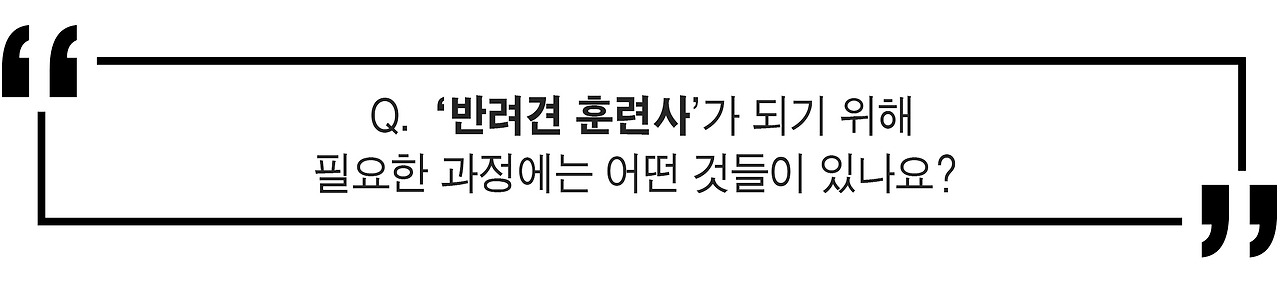 강형욱 : 우리나라에서 시작할 수 있는 첫 단계는 반려 동물 관력 학과를 통한 진입이에요. 수의학과에 들어가서 훈련사로 오시는 분들이 많은데요. 반려견의 성질, 성향, 섭취 음식 등 기본 교육을 충분히 습득한 다음 일반적인 훈련사로 생활하다가 자신의 전문 분야를 찾게 됩니다.