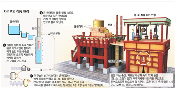 즉 시간이 지날수록 가장 아래에 있는 항아리에 일정하게 물이 공급되도록 하여 그 안에 눈금을 매긴 잣대(자의 종류)를 띄워 놓는 것이었습니다. 그러면 항아리 안의 물이 늘어나는 대로 잣대가 떠오르는데, 이 잣대의 눈금을 읽어 시각을 알아낼 수 있었던 것이죠.