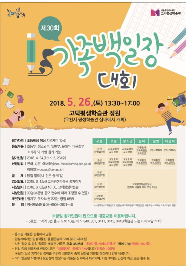 고덕평생학습관에서는 5월 26일(토) 가족, 지역주민이 다 함께 참여하는 ‘가족 백일장 대회’를 개최하는데요. 입상자는 서울특별시 교육감상을 수여받고 입상작품집 ‘글밭에 모여 앉아’도 발간하게 된답니다.