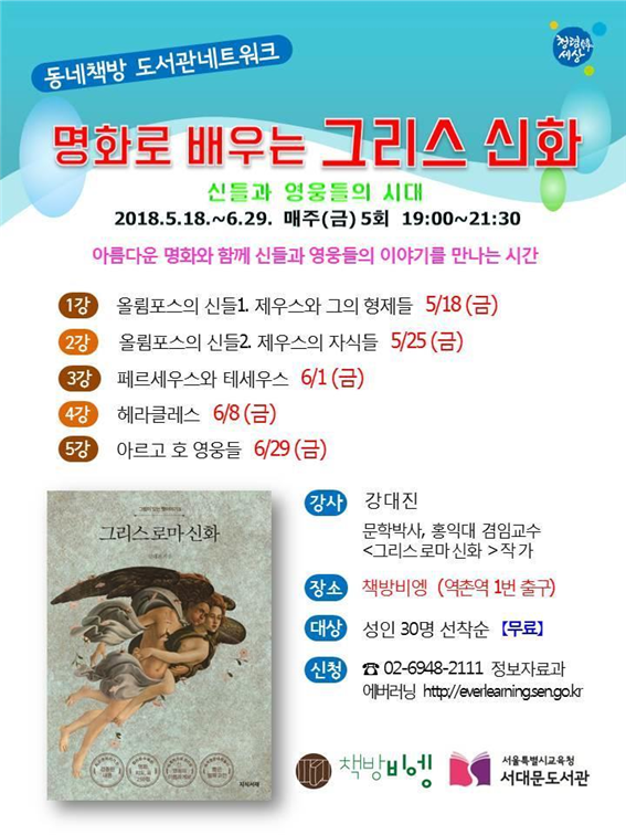 서대문도서관에서는 역촌역의 첵방비엥과 함께 ‘명화로 배우는 그리스 신화’ 로 아름다운 명화를 통해 영웅들의 이야기를 만나보는 시간을 마련합니다.