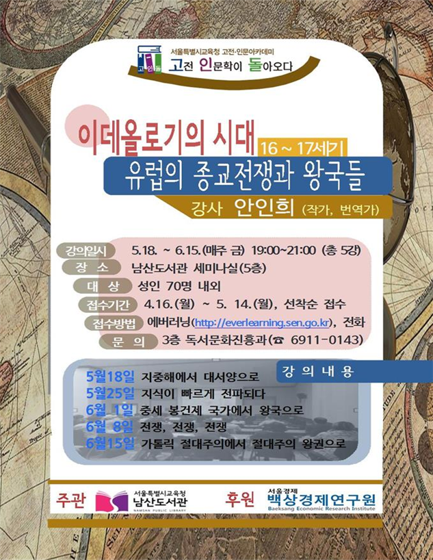 남산도서관에서는 ‘고전 인문학이 돌아오다’ 강좌로 ‘이데올로기의 시대 유럽의 종교전쟁과 왕국들’을